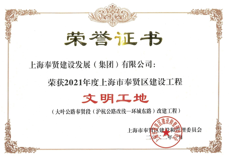 2021年度上海市奉贤区建设工程文明工地—大叶公路奉贤段(沪杭公路改线-环城东路)改建工程