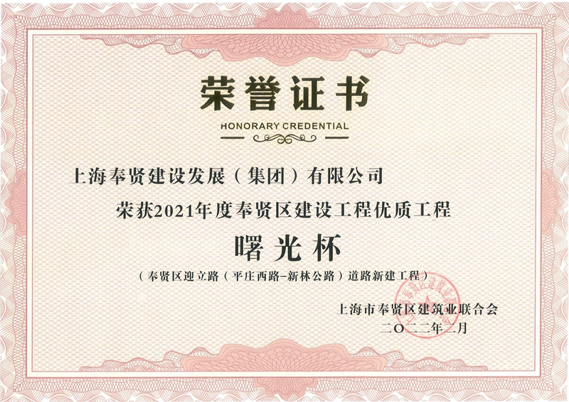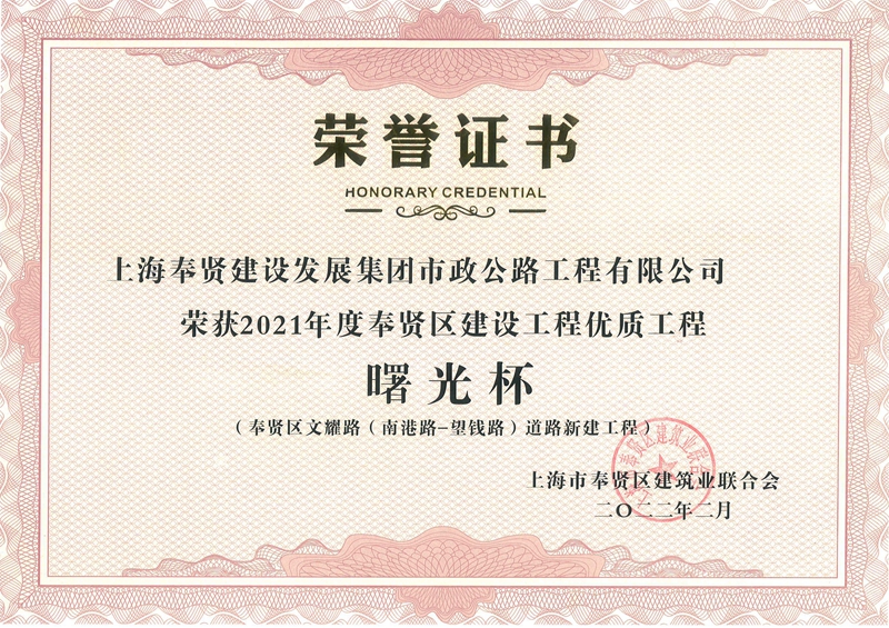 2021年度奉贤区建设工程优质工程曙光杯——奉贤区文耀路(南港路-望钱路)道路新建工程)