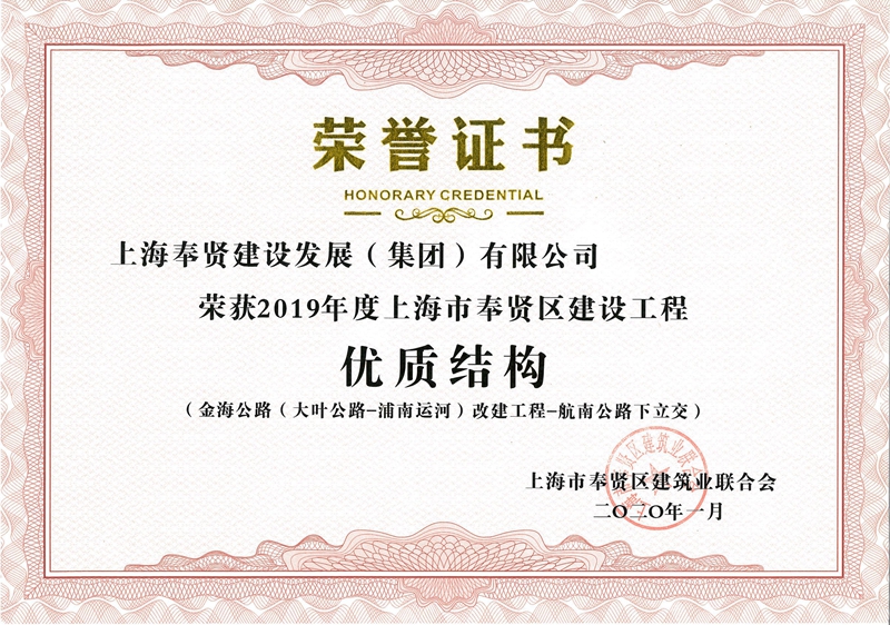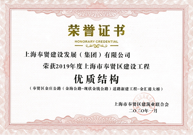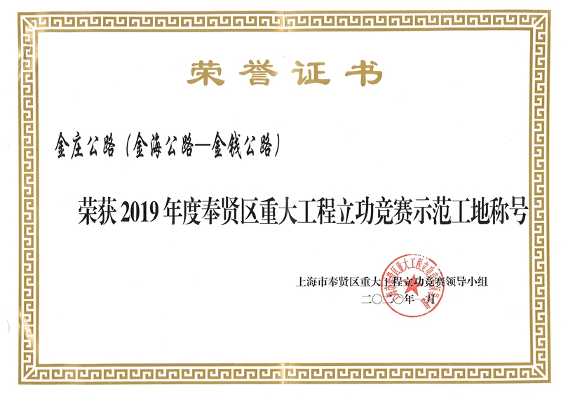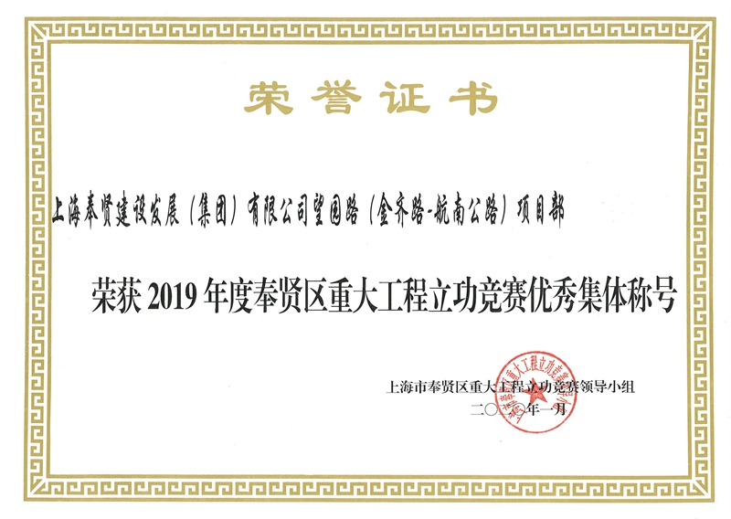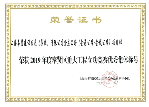 2019年度奉贤区重大工程立功竞赛优秀集体—金庄公路(金海公路—金钱公路)项目部