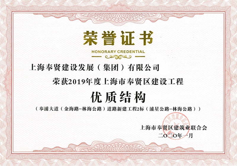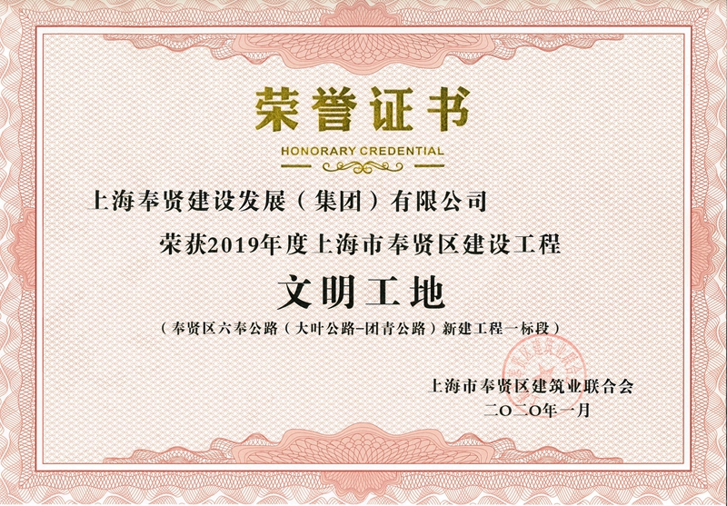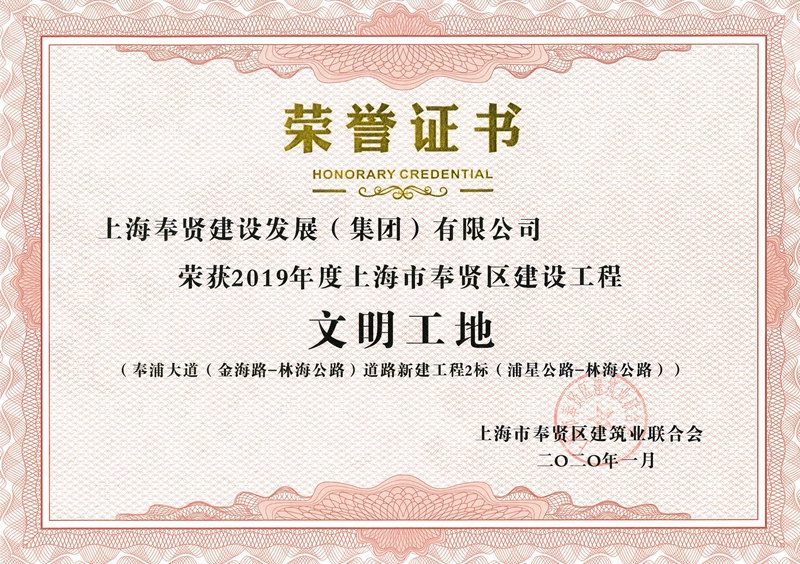 2019年度奉贤区重大工程立功竞赛优秀集体—望园路(金齐路-航南公路)项目部