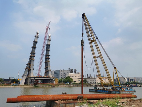 民乐路金汇港大桥钢结构主塔喜封金顶