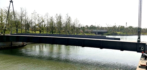 东方美谷论坛酒店东侧桥梁钢箱梁吊装