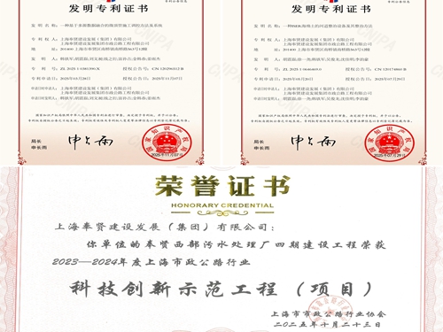 近期,公司自主研发的《一种基于多源数据融合的微顶管施工调控方法及系统》、《一种 ISER 海绵土的河道整治设备及其整治方法》两项技术成功获得国家发明专利授权。与此同时,由公司承建的奉贤西部污水处理厂四期建设工程凭借创新技术应用与显著示范效应,荣获“2023-2024年度上海市政公路行业科技创新示范工程(项目)”。